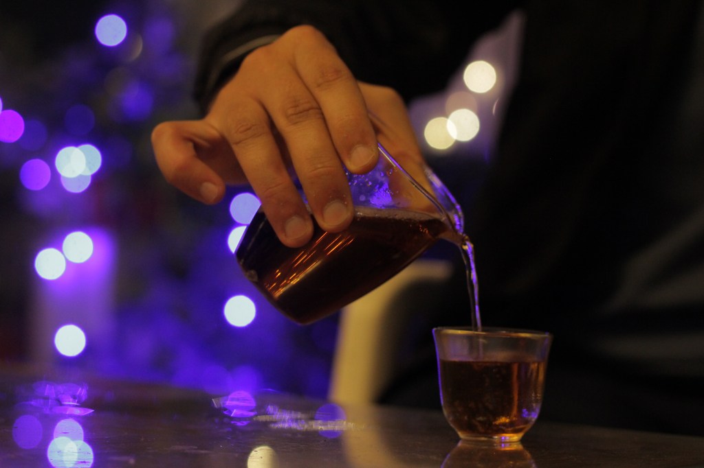 Tea: Dianhong black tea is poured from the pitcher into a transparent cup in New Delhi