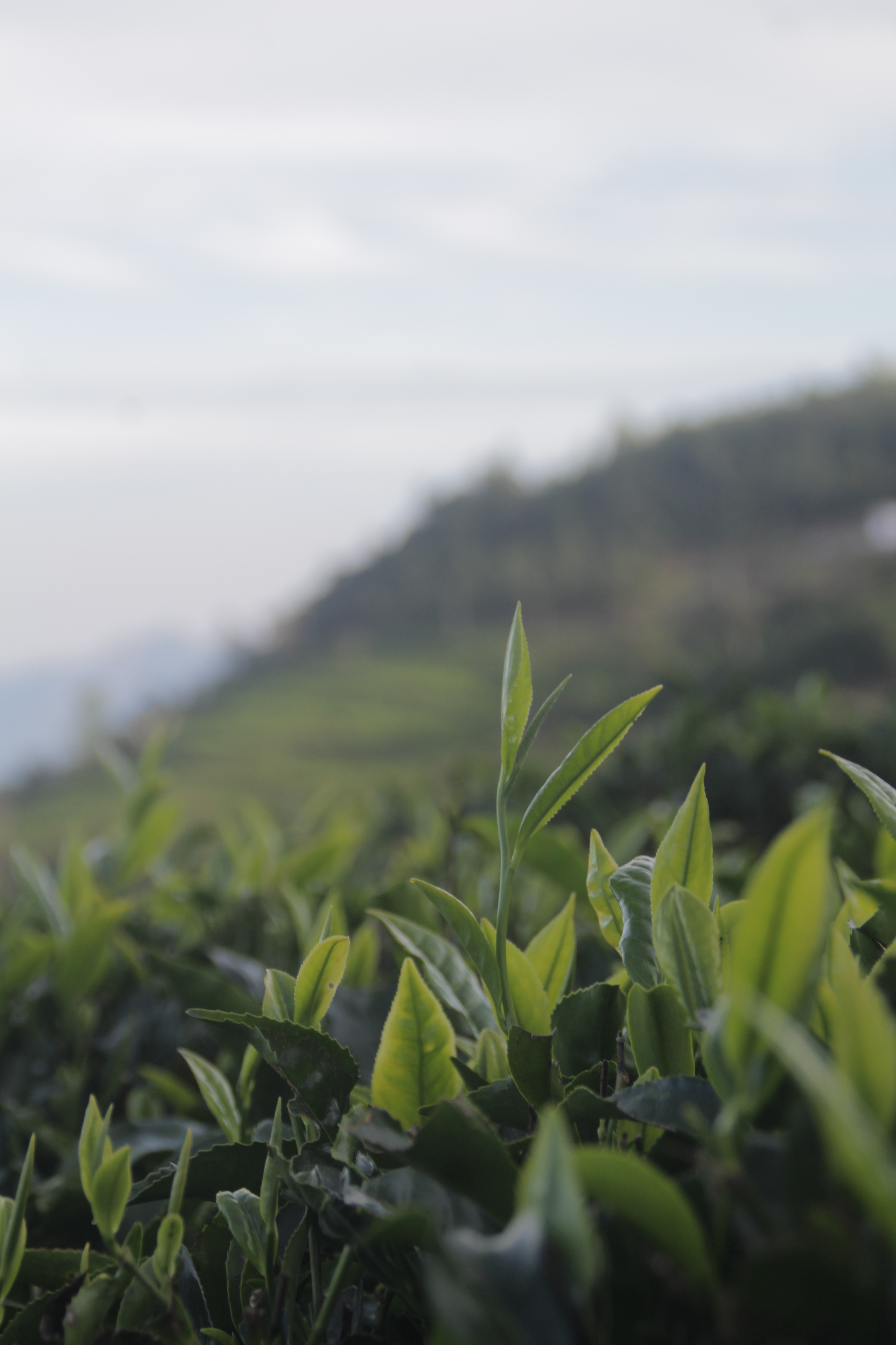 Nilgiris: A bud and two leaves of Camellia Sinensis are in focus against the Nilgiris background.