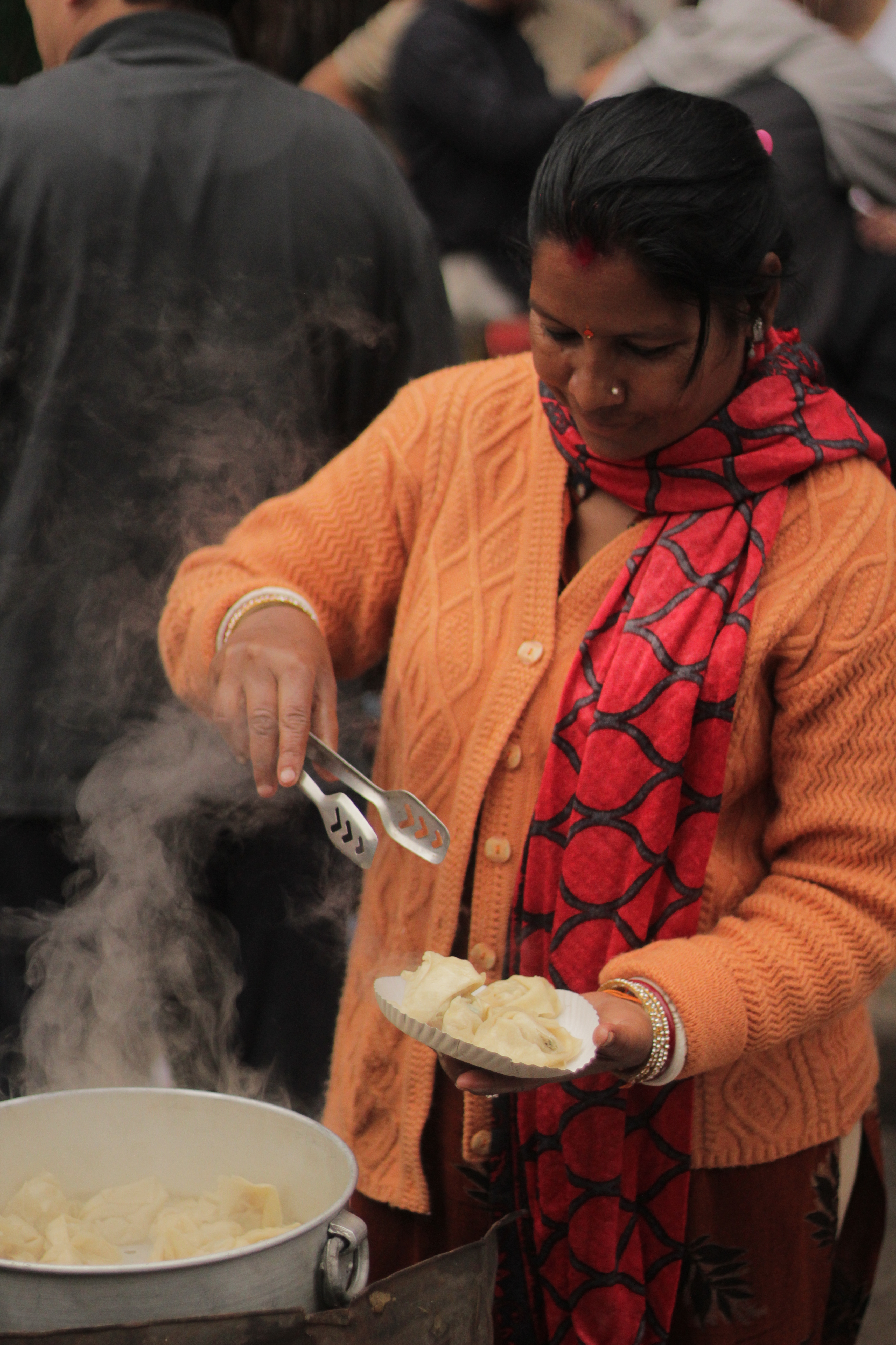 Kolkata: a street vendor selects momos to serve on a paper plate in Tiretti Bazaar