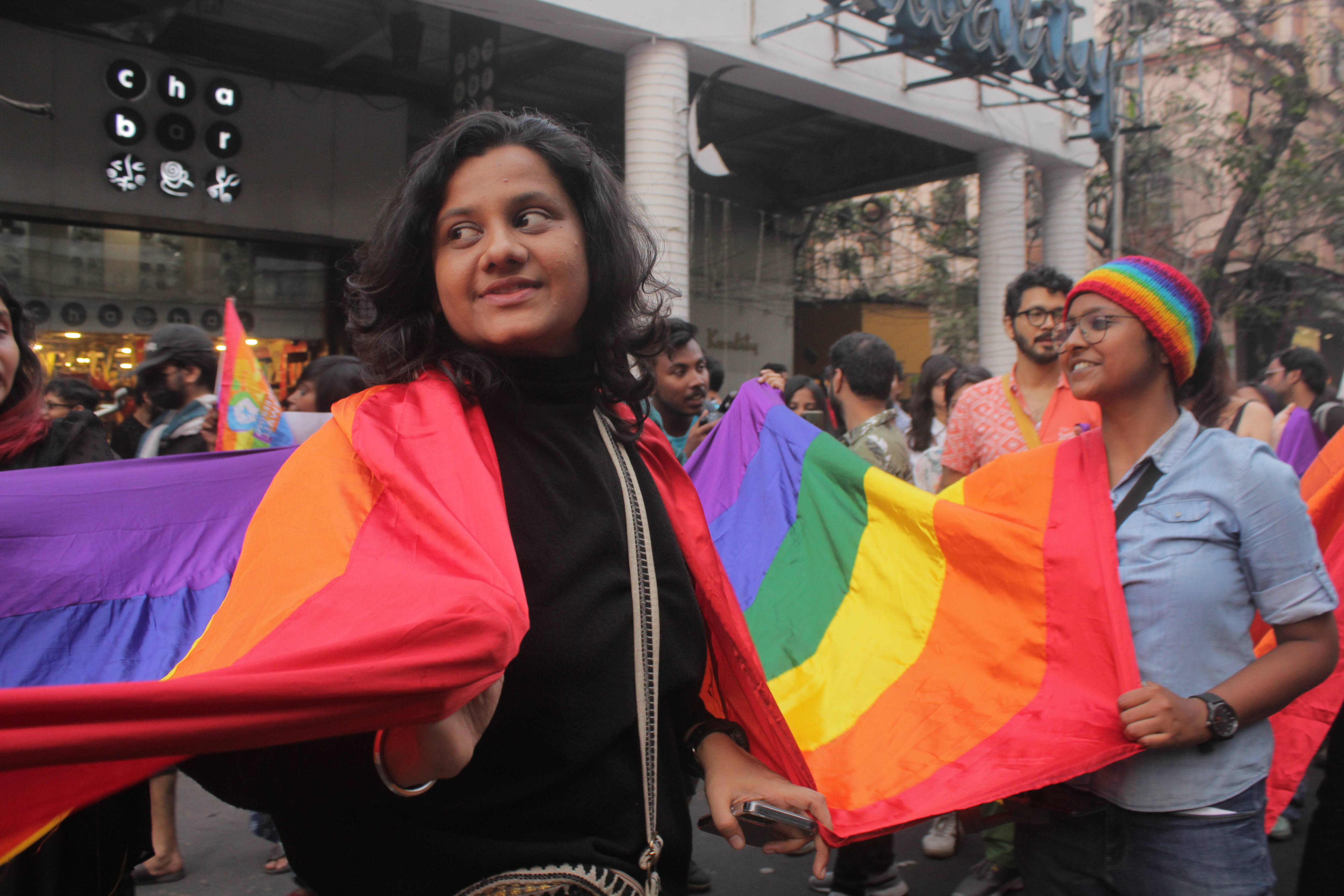 Kolkata: a young woman hoists the pride flag abover her body during Pride Parade